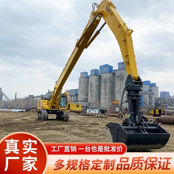正是因?yàn)橥诰驒C(jī)的標(biāo)準(zhǔn)臂長度不能滿足某些工作場(chǎng)合,所以越來越多挖掘機(jī)都采用加長臂來填補(bǔ)這片空白,如深坑作業(yè)的地基工程,高空作業(yè)的樓房拆卸或河道清理等領(lǐng)域的建設(shè)和維護(hù)等,都必須用到加長臂才能高 效快捷地完成工程要求的各項(xiàng)指標(biāo)。城市的不斷擴(kuò)張,老舊城區(qū)的拆遷。政府出于安全的考慮,對(duì)相對(duì)較低樓層不進(jìn)行爆破拆除,而選擇了三段加長臂進(jìn)行拆除。三段加長臂在原有的兩段加長臂的基礎(chǔ)上面加了一段中臂。中臂可以在很大的程度上面能夠保護(hù)司機(jī)的安全。三段式加長臂都是帶錘或者液壓剪進(jìn)行工作。